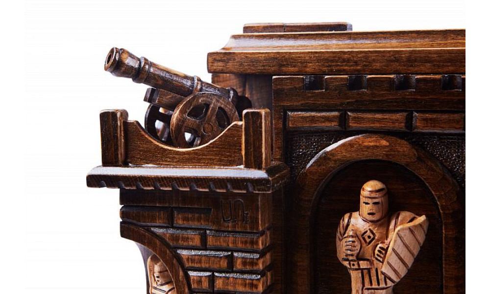 Почувствуйте себя на настоящем поле эпичной битвы, пребывая при этом в безопасности. Резные шахматы в ларце «Пушка» предоставляют такую возможность. Изготовленные вручную из буковой древесины талантливым мастером они – настоящее произведение искусства. Углы массивной высокой доски украшены вырезанными пушками. Резные фигуры, стилизованные под воинов, прячутся в выдвижные ящички, вмонтированные по бокам внизу доски. Сама же доска не складывается. Для обеспечения долговечности каждый элемент покрыт защитным лаком.